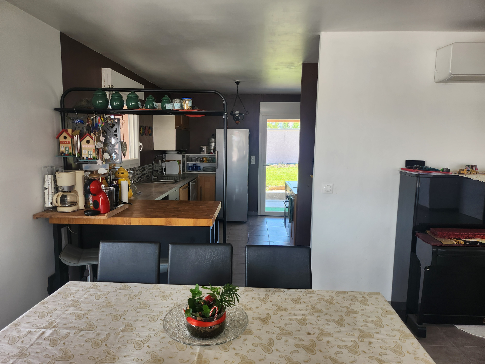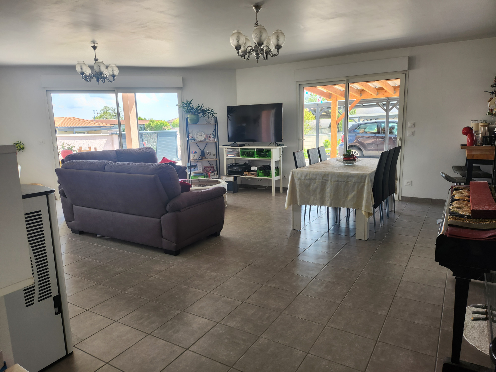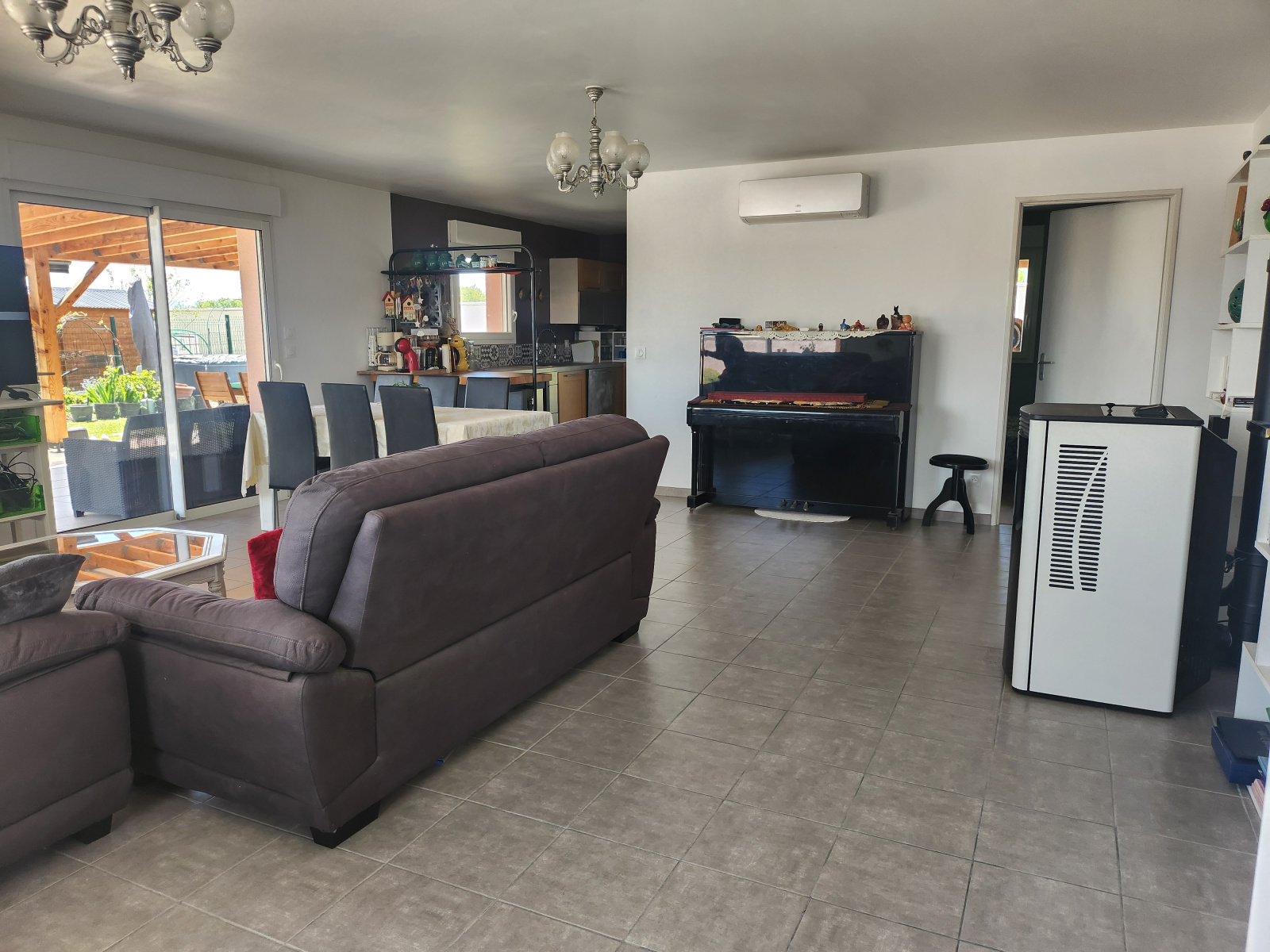 Pièces de vie : Salon/séjour spacieux et lumineux donnant sur le jardin, cuisine équipée ouverte